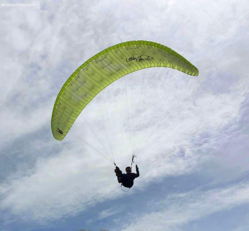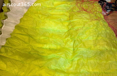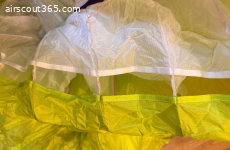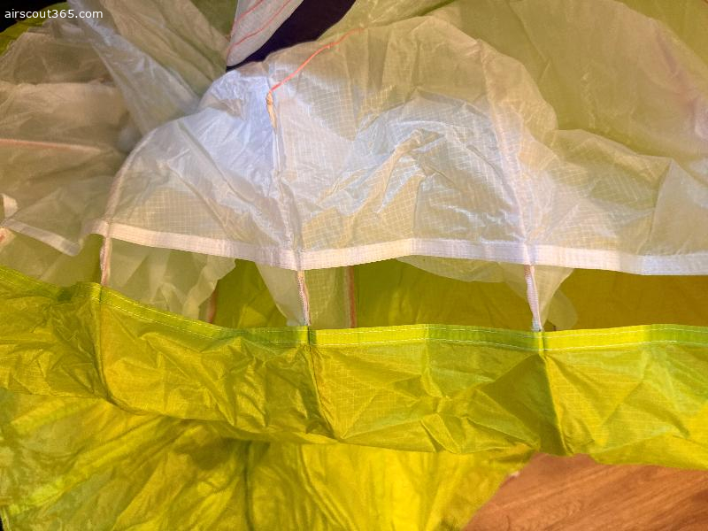 Sehr gepflegter Zustand, keine Crashs, sauber. Tuch, Leinen und Risers tiptop. Es gibt einen minikleinen Patch (ca 1€ Münzen groß), quasi unsichtbar, siehe letztes Foto. Sonst makellos.